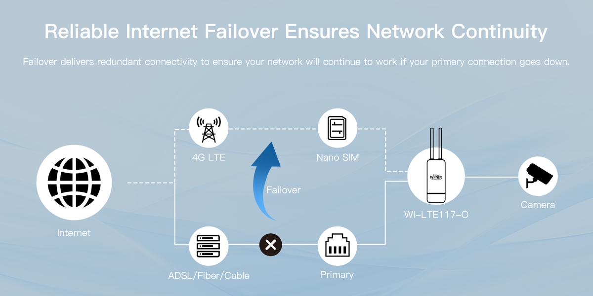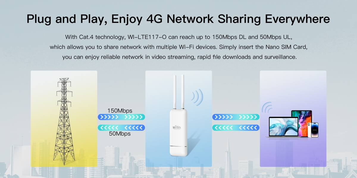 Wi-Tek WI-LTE117-O V2 is an outdoor 4G LTE router that provides a reliable data connection with download speeds of up to 150Mbps and upload speeds of up to 50Mbps (LTE Cat. 4) when a SIM card is inserted. The router is equipped with (1) LAN/WAN PoE-Out/PoE-In port, (1) LAN PoE-Out port and Wi-Fi 4 wireless connectivity.