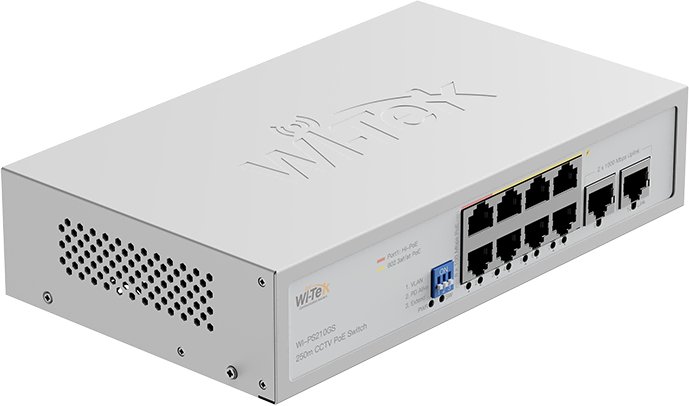 Wi-Tek WI-PS210GS (V2) is an unmanaged PoE switch with (10) ports in a combination of (2) 1Gbps UP-link ports and (8) 100Mbps PoE-OUT ports. The first PoE-OUT port supports powering devices with up to 60 W per port thanks to Hi-PoE technology, while the remaining seven PoE-OUT ports provide PoE 802.3af/at up to 30 W per port. The total PoE budget is 95 W. The switch is ideal for applications where you need to connect and power devices such as IP cameras (including PTZ) or IP phones.