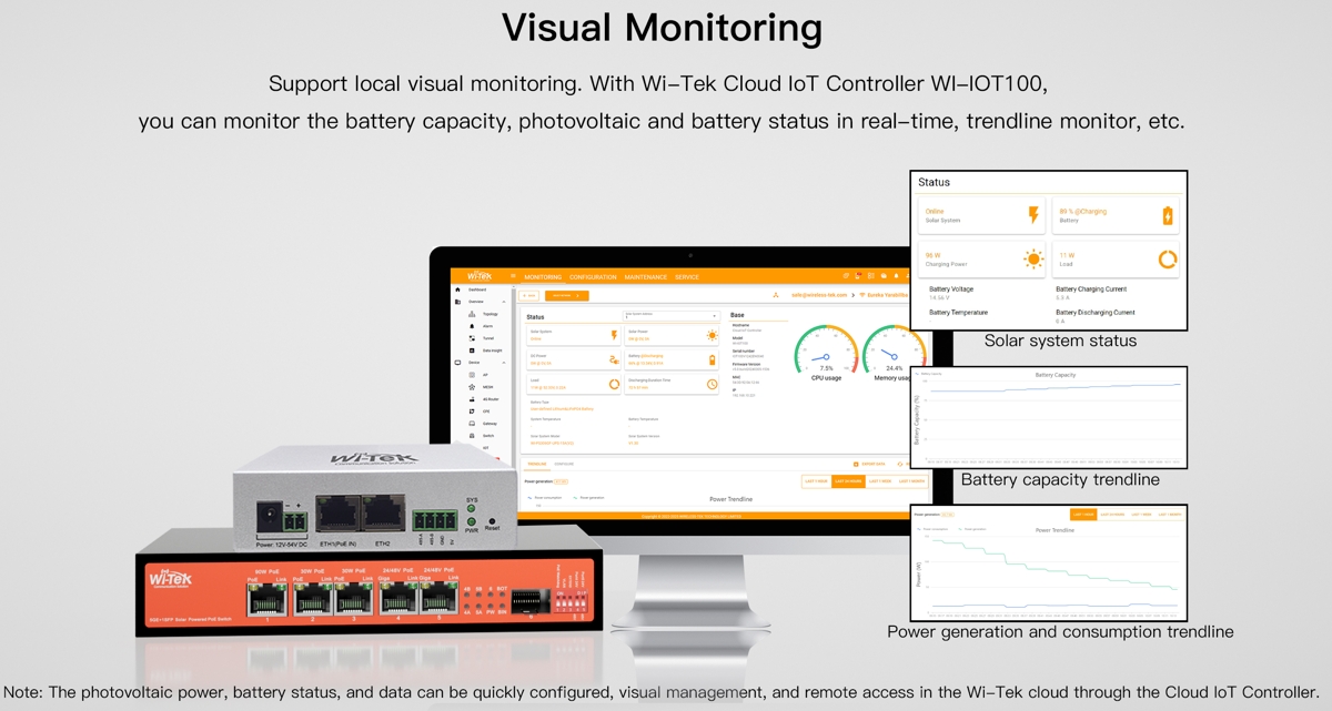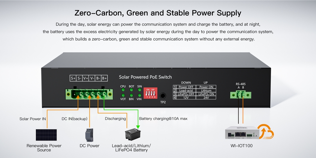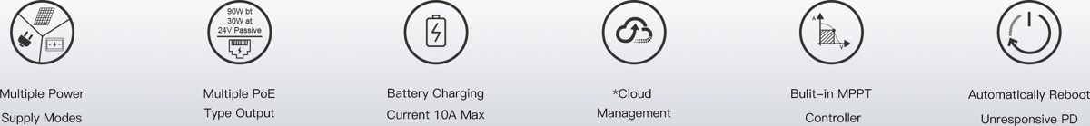 Wi-Tek WI-PS306GF-UPS V4 is a solar powered Gigabit PoE switch with UPS functionality featuring a switching capacity of 12 Gbps, (5) Gbit PoE ports and (1) SFP slot. The integrated MPPT controller optimizes solar panel performance by monitoring voltage in real time and ensuring efficient battery charging. It manages power flow between solar panels, the battery, and connected loads, allowing the system to operate on solar energy during the day and on battery power at night. The switch consumes <5W (without PoE load).