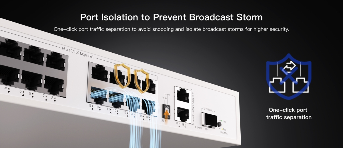 The Wiking WK-PS219GF is a reliable unmanaged PoE L2 switch with a switching capacity of 9.2Gbps, (16) 10/100Mbps PoE ports, (2) 1Gbit uplink ports and (1) SFP uplink slot. The downlink ports support PoE with a 180W budget. The switch is ideal for CCTV installations thanks to PoE, automatic IP camera reboot in case of connection failure and the option to extend the transmission distance of PoE ports up to 250m. The switch consumes 10W (without load).